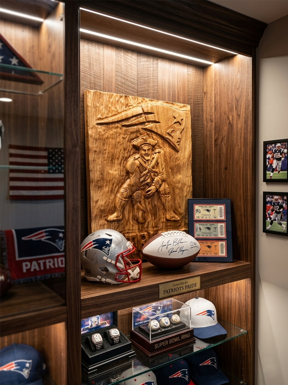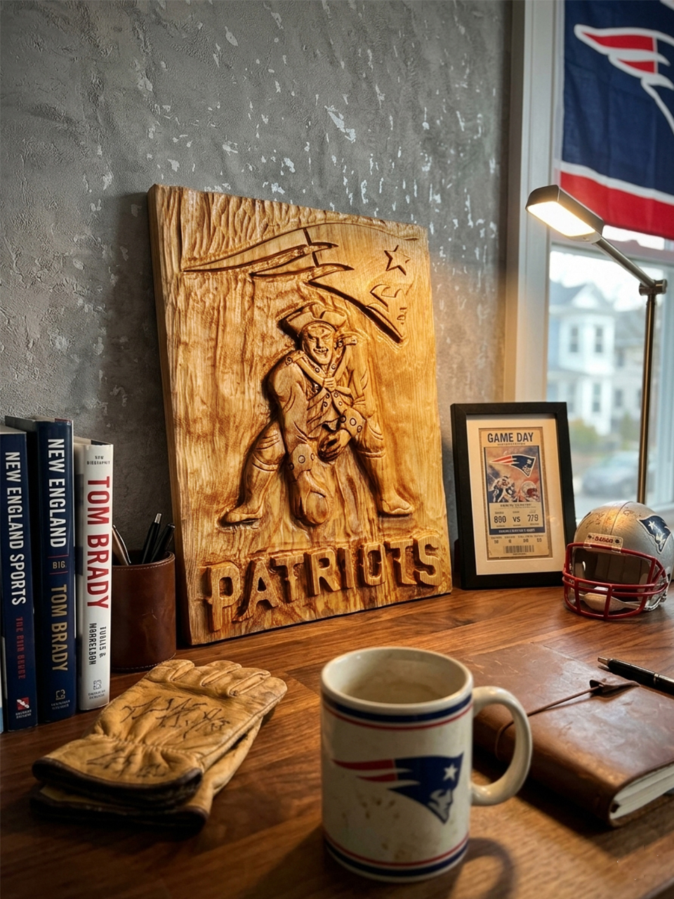 This was built for the New England faithful who demand the best. Hand-crafted from heavy, solid natural wood, this 3D relief carving brings the raw energy of the Patriots directly into your personal space.