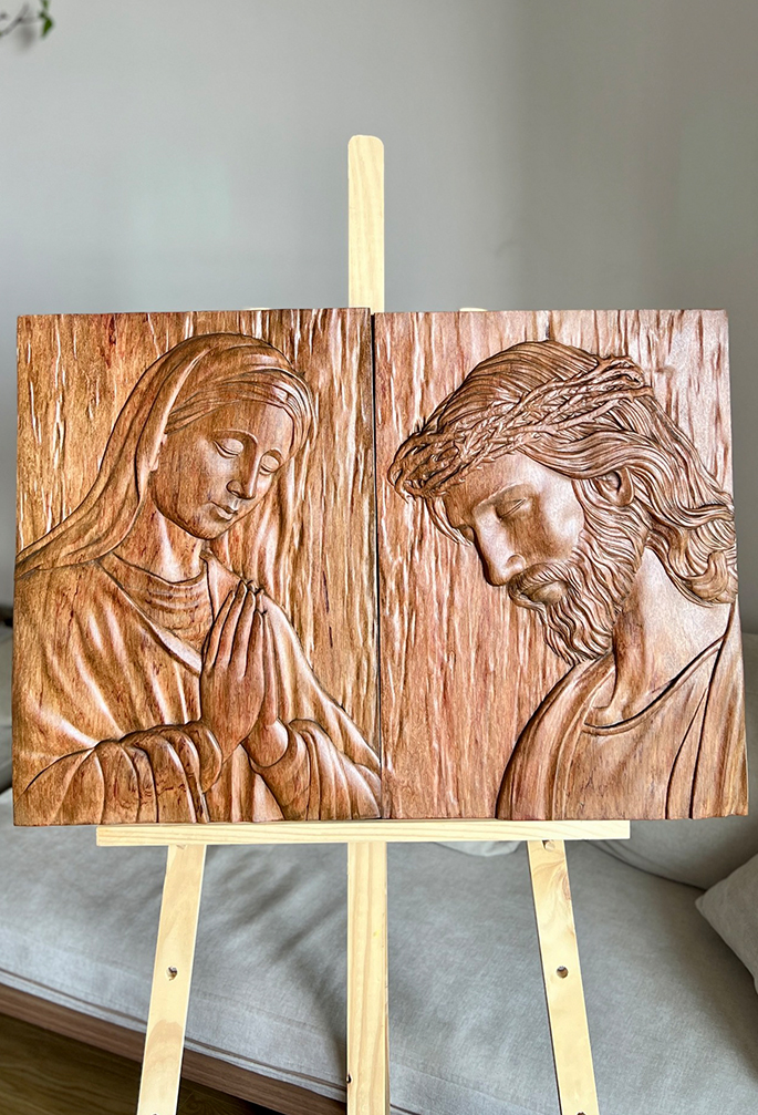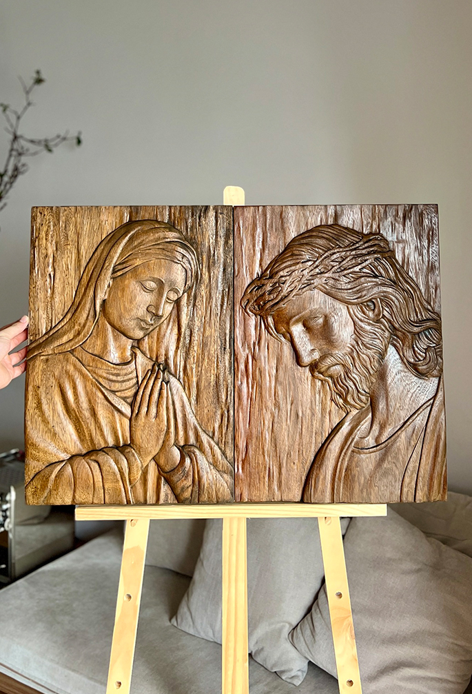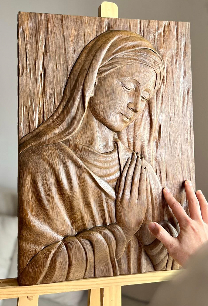 Hand-Carved Virgin Mary Wooden Wall Art (12″ × 9″)